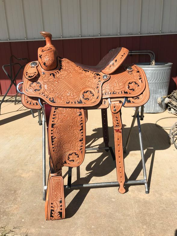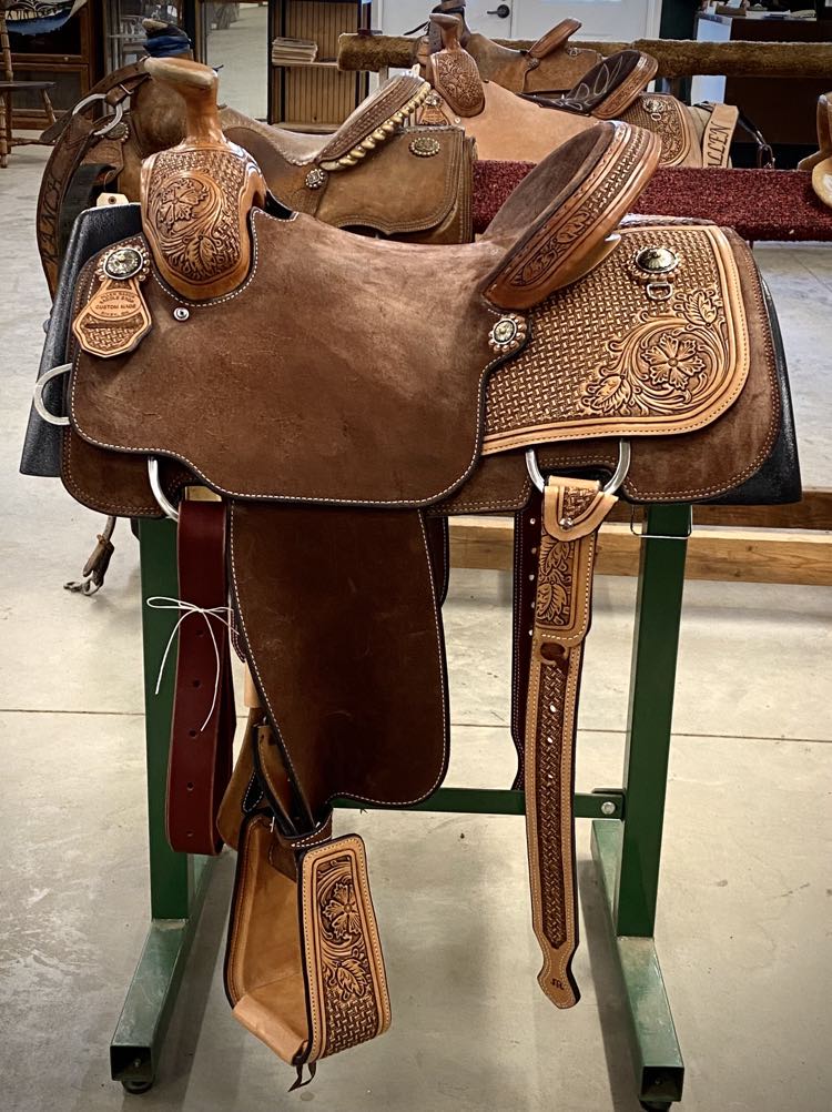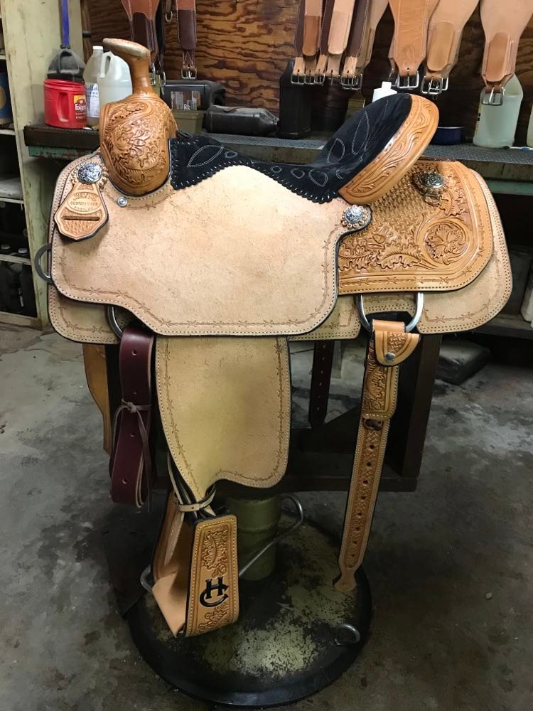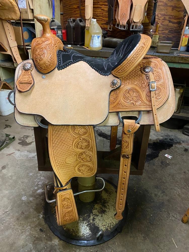 Natural Leather Rough Out Seat Jockeys Tooled Bixby Oak and Sheridan Boarder with Hamley Swirl On the Swells, Housings, and Binder Simple Boarder Tooled on Skirts Sheridan and Bixby Oak with Boarder on Fenders Full Black Suede Seat