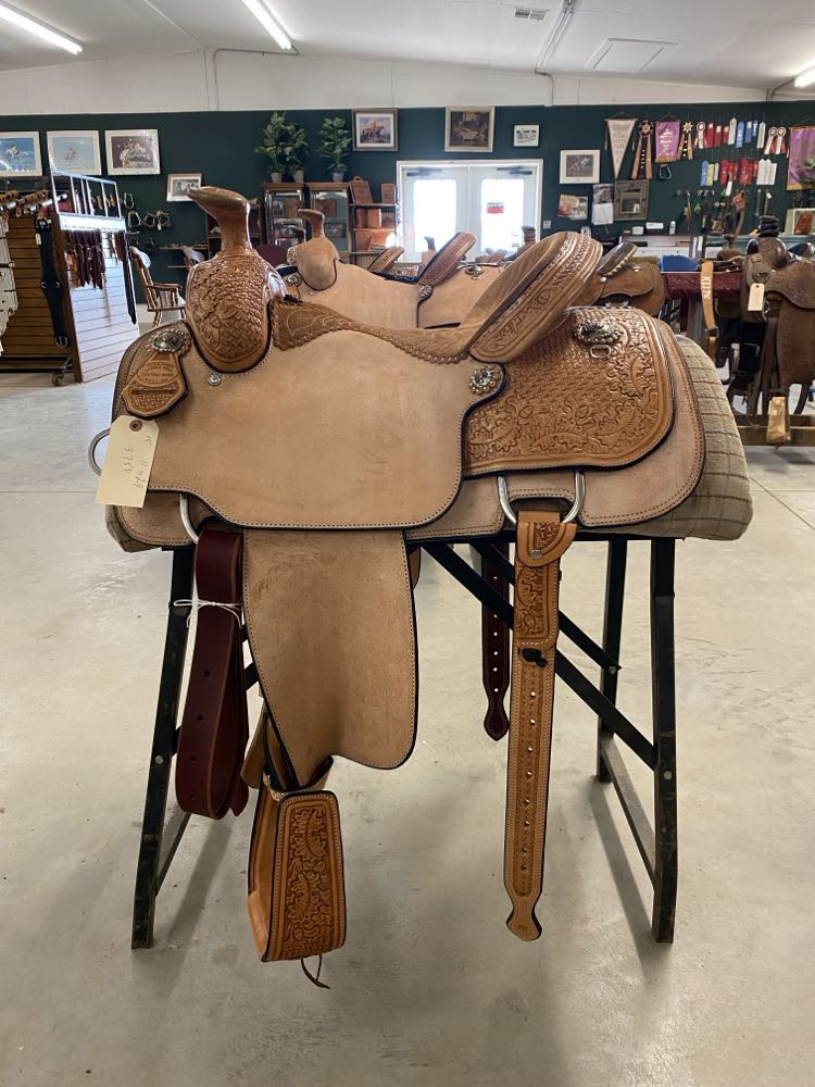 Natural Leather Rough Out Seat and Fenders Bixby Oak Boarder and Hamley Swirl on Swell, Skirts and Housings Tipton Binder Hard Seat